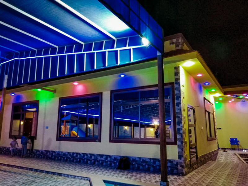 Newly constructed in 2021 & commenced on 1st march, Halla Gulla Farmhouse is one of the most luxurious farmhouses in Karachi. We provide multiple amenities and services along with indoor games. With our newly introduced Corian™ slides, dive into a fun filled experience. Halla Gulla Farmhouse offers beautiful ambience as well as spacious bedrooms with attached baths and a living room. A luxurious swimming pool with an innovative rain fountain design, a separate watershower pool with neon lighting for night view, and a kids' pool are available. Other amenities include indoor games such as snooker, soccer table and dabbu. Separate bonfire area and barbecue/dining area with seating capacity for 50 persons is available as well. Book your stay with us and we will assure you a truly relaxing holiday experience with the comforts of your home.
